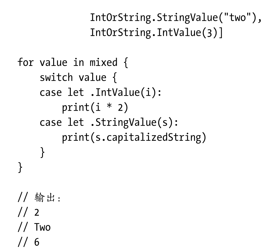 这种方法虽然也损失了一部分类型信息,但是相对于Any或者AnyObject还是改善很多,在对象存在某种共同特性的情况下无疑是最方便的。另一种做法是使用enum可以带有值的特点,将类型信息封装到特定的enum中。下面的代码封装了Int或者String类型:
