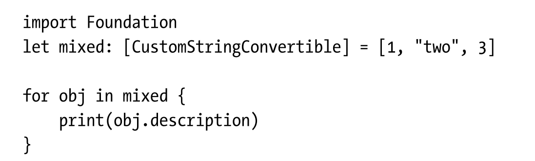 其实我们注意到,Any其实是protocol,而不是具体的某个类型。因此在容器类型泛型的帮助下,我们不仅可以在容器中添加同一具体类型的对象,也可以添加实现了同一接口的类型的对象。绝大多数情况下,我们想要放入一个容器中的元素或多或少会有某些共同点,这就使得用接口来规定容器类型会很有用。比如在上面的例子中,如果我们需要的是打印出容器内的元素的description,可能我们更倾向于将数组声明为[CustomStringConvertible]的: