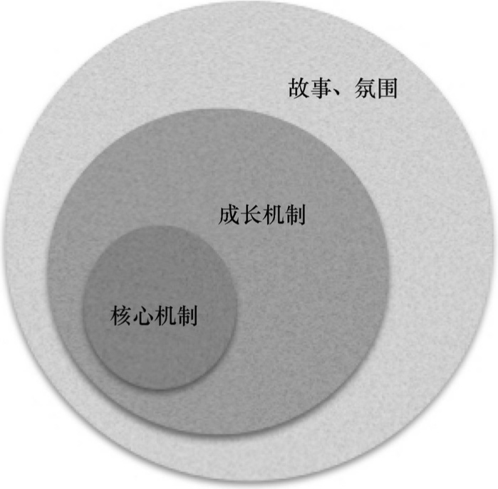 中圈:游戏的成长机制。由核心机制的结果驱动,规范玩家在游戏中逐渐成长过程的推进机制或养成机制。