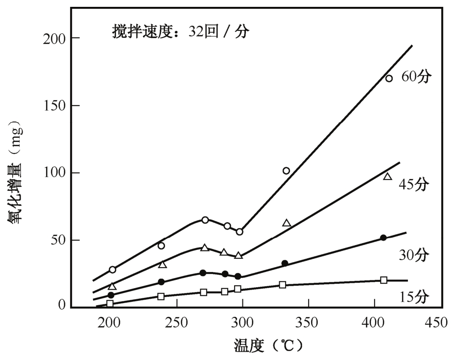 图4.1 在搅拌条件下Sn40Pb焊料的氧化增量与温度及搅拌时间的关系