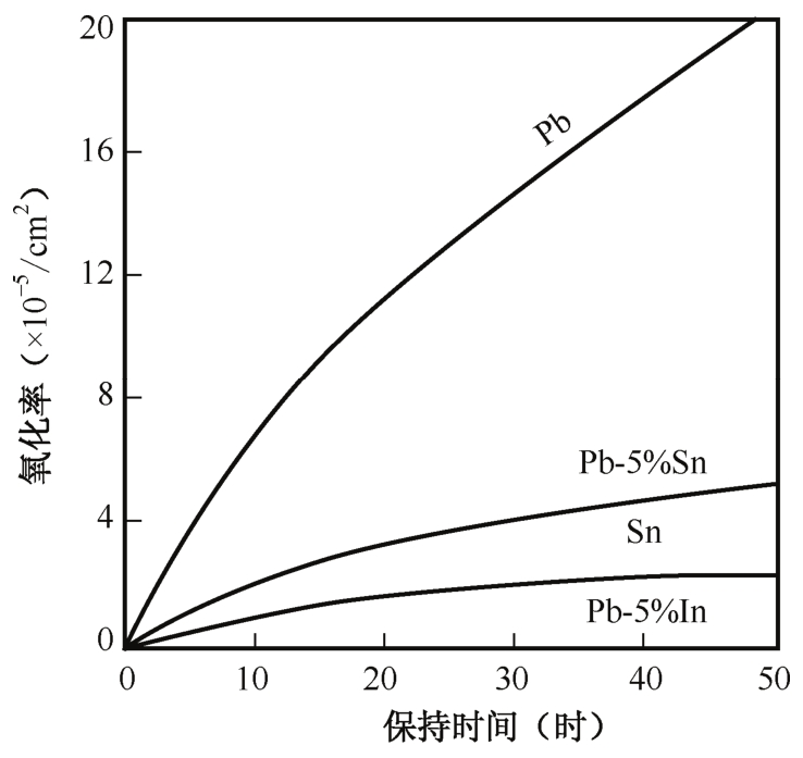Pb系焊料的氧化率,如图4.3所示。而含有Sn、In的焊料较不易氧化,特别是添加了In元素时抗氧化效果更好。