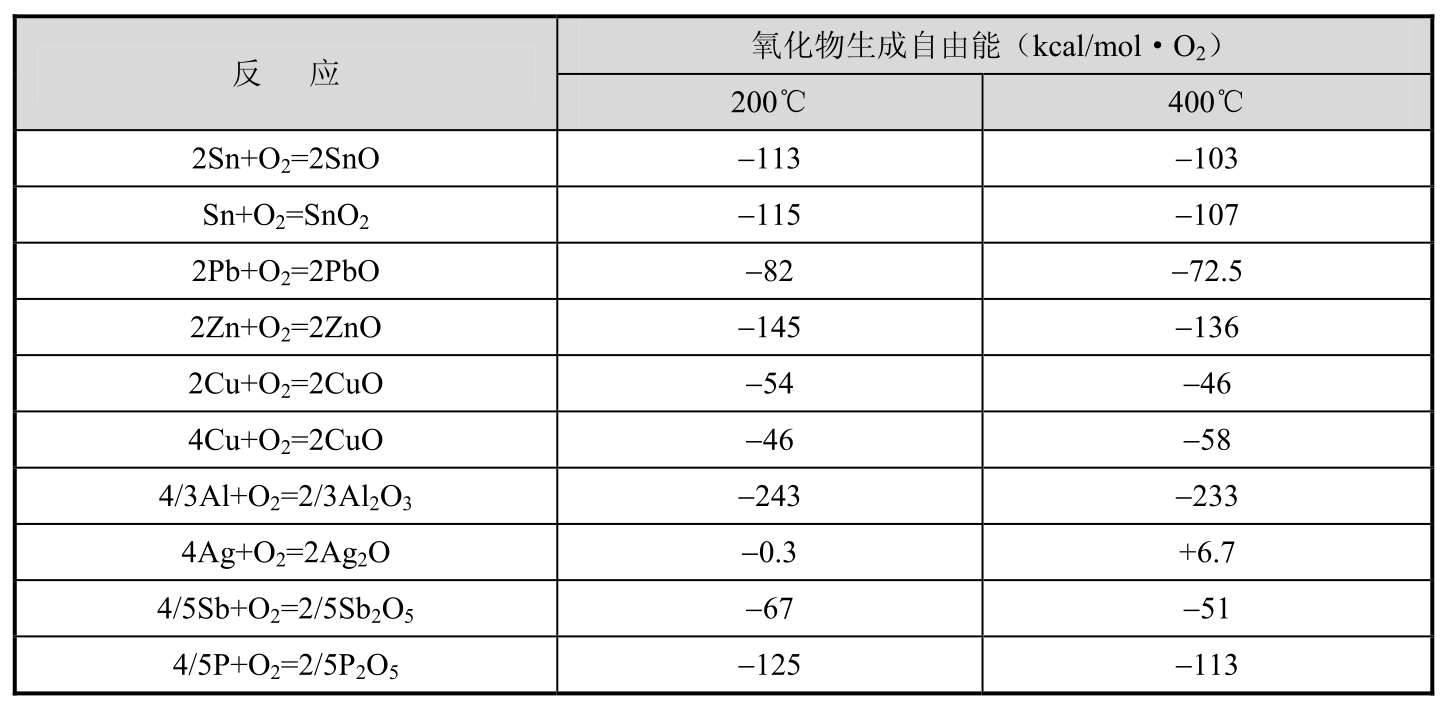 从而,如果知道了△F即可求得P O2 ,由此,可以预测金属的氧化亲和力的大小。和焊料成分相关的主要金属的氧化物生成的标准自由能,如表4.1所示。