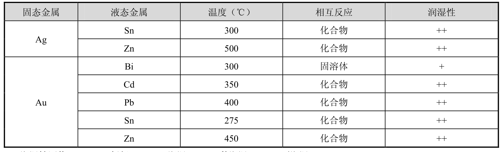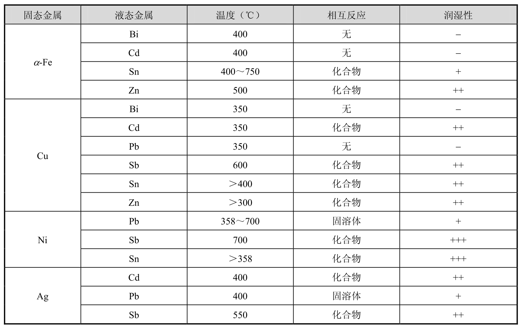 焊接作为液态熔融钎料和固态金属母材的直接接触,在其界面上形成的合金层是由母材的溶解反应而引起的,其结果是γ LF 或γ LS 的变化,钎料的润湿性也在变化。各种固态金属对液态钎料的润湿性,可以看成是两者的金属学的相互反应,如表1.3所示。