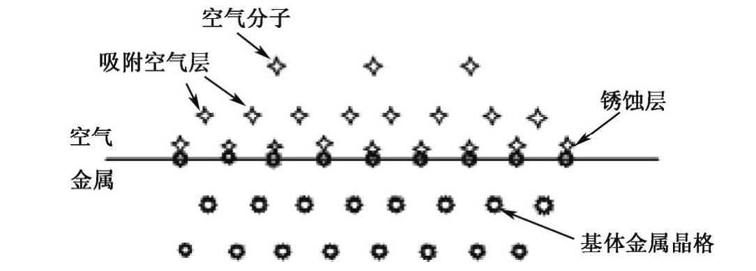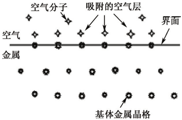 但是,当净化金属表面暴露于空气中时,由于表面产生的吸附现象,基体金属的表面能量将吸引空气分子使其靠近金属表面,在紧贴基体金属表面形成一吸附空气层,如图1.28所示。由于空气中的氧能够侵蚀大多数金属,基体金属表面被氧侵蚀所形成的锈膜所覆盖。而位于外层的空气分子被重新吸附于该锈膜表面,其他空气分子随机地散布在金属表面上部的整个空间中,如图1.29所示。由于吸附的空气层和锈膜层使得基体金属变得不可焊,故在焊接过程中吸附的空气层和锈膜层均必须被清除掉。