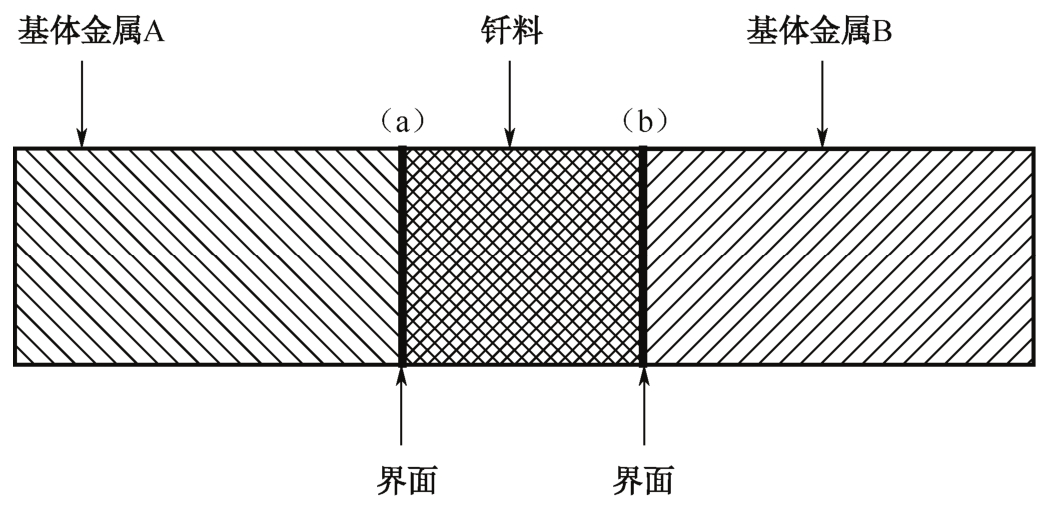 当两个基体金属被用钎料连接在一起时,由于钎料分别和两个基体金属连接在一起而形成两个连接界面,从而建立了金属的连续性。每个焊点至少有两个这样的连接界面。我们来考察从基体金属A到基体金属 B 的金属连续性结构,即:由基体金属A→基体金属A 与钎料的连接界面(a)→钎料→钎料与基体金属B的连接界面(b)→基体金属B,如图1.27所示。显然,钎料既是连接的媒介,也是构成基体金属连续性中的一个组成环节。