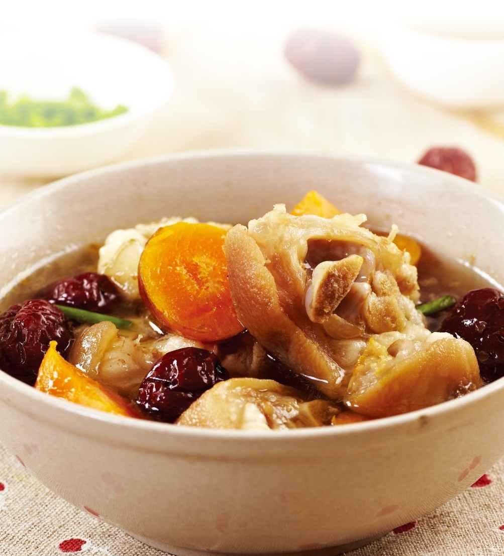 原料 猪蹄500克,红枣20克,胡萝卜100克,盐、味精、料酒、胡椒粉各适量。