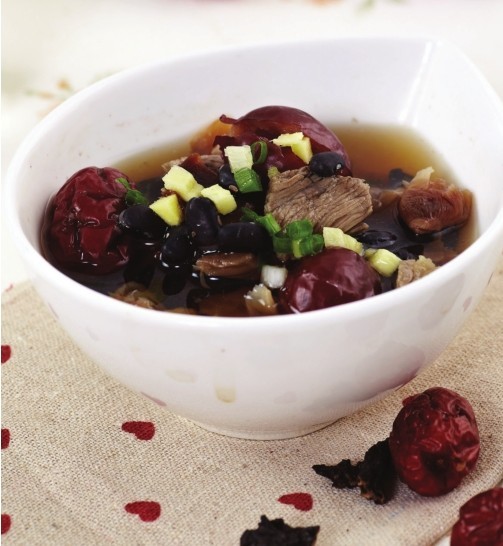 2.牛肉洗净,切大片,放入锅中加冷水煮开,放入料酒,将制何首乌、黑豆、红枣、桂圆肉放入汤中煲2小时,加盐、葱末、姜末调味即可。