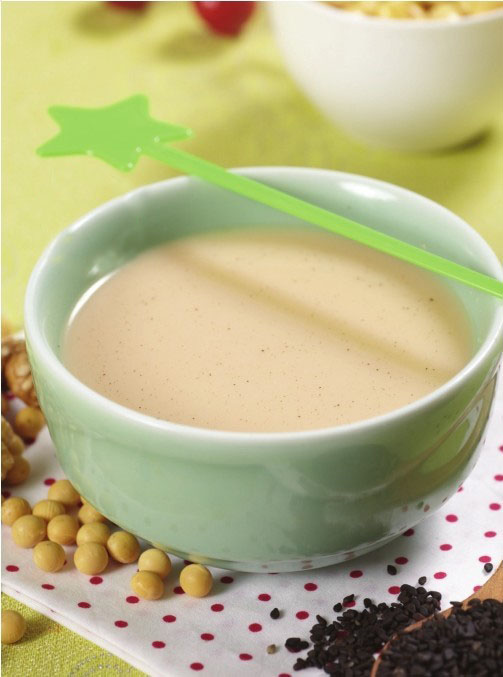 原料 黄豆55克,核桃仁10克,熟黑芝麻5克。