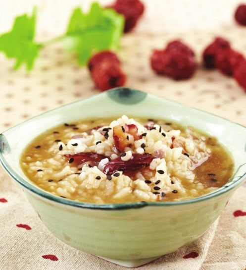 2.把羊腰洗净,切碎,放入羊骨汤汁中,加入芝麻、糯米、红枣和红糖,温火煮熟即可。