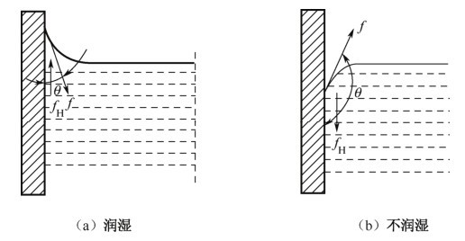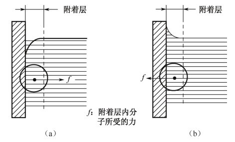润湿或不润湿,本质上是由液体分子与固体原子之间的相互吸引力(称为附着力)大于或小于液体分子之间的相互吸引力(称为内聚力)决定的。在液体和固体接触处,厚度等于分子作用半径的一薄层液体叫作附着层,如图2.26所示。附着层中的分子与液体内部的分子不同,其作用球有一部分在固体之中,因此受力不对称。如果附着力小于内聚力,则分子所受的合力垂直于附着层而指向液体内部,如图2.26(a)所示,有尽量挤入液体内部的趋势。因此,附着层有收缩倾向,这就是不润湿的根源。反之,如果附着力大于内聚力,则分子所受的合力垂直于附着层而指向固体,如图2.26(b)所示,于是分子在附着层内的位能比在液体内部小。根据平衡时位能最小的原理,液体内部的分子将尽量挤入附着层,结果附着层有伸张倾向,这就是产生润湿的原因。总之,附着力大于内聚力,就发生液体能润湿固体的现象;而附着力小于内聚力,就发生液体不能润湿固体的现象。