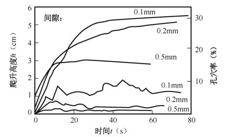 图2.30 钎料爬升高度、孔穴率与毛细间隙的关系