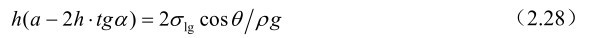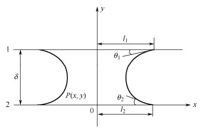 设两平行板所构成的间隙为a,插入液态钎料后钎料爬升高度为h,由拉普拉斯方程及几何关系和流体静力学可推导得出:
