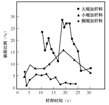 此外,不平行间隙还为夹气和夹渣等缺陷的自动排除提供了可能性。如果在不平行间隙内由于大小包围现象而形成了夹气,当气泡的尺寸大于间隙值时,由于受到上下基体金属的限制,间隙内的气泡会形成像鸡蛋一样一端大、一端小的形状,在受到附加压不平衡的情况下,气泡会从大间隙端排除,如图2.36所示。实验结果表明,随着钎焊时间的延长,不等间隙钎缝内部的缺陷比例有降低的趋势(见图2.37)。