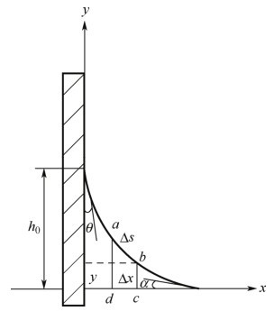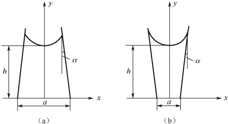 如果处于竖直位置的两平板构成不平行间隙并插入液态钎料中,两平板与y轴的夹角均为α,在钎料槽液面处(y=0)的间隙为a(见图2.33),对于上小下大的间隙下图中(a)有: