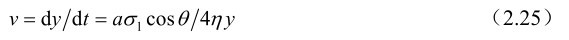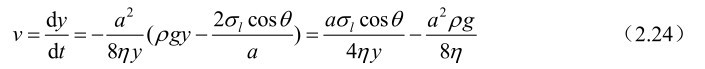 由式(2.24)可以看出,上升速度与1/y成线性关系。但实际上,爬升液体的前沿不整齐,弯曲液面的形状不规则,因而造成内部空穴,这是由于在式(2.24)的导出过程中假定了壁面处 v=0,而且上升过程中-2σcosθ/a 保持恒定。这与实验条件是不符合的。当 y和a很小时,式(2.24)中的第二项可以忽略,于是简化成