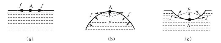 当液面为曲面时,会产生一种压力,称为附加压力,其定义为弯曲相界面时液体所受压力与平相界面时液体所受的压力差,即任意形状界面时比平界面时多出的压力。液体的表面薄膜与拉紧了的弹性膜相似。如果液面是水平的,则表面张力也是水平的,如图2.28(a)所示。如果一弯曲液膜的周界在一平面内,则这一薄膜本身也有取平面形状的趋势。凸膜变平的趋势对下层的液体施以压力,如图2.28(b)所示;反之,凹膜变平的趋势对下层的液体起拉伸的作用,如图2.28(c)所示。换句话说,与平液面下的液体所受的压强相比,弯曲的液面对液体内部都施以附加压强;在凸面情形下,这个附加压强是正的,在凹面的情形下,这个附加压强是负的。
