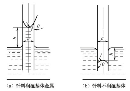 当把钎料放在钎缝间隙附近时,钎料熔化后有自动填充间隙的能力,即所谓的钎料填缝。这是由于液态钎料对基体金属润湿产生弯曲液面所致。如果将金属细管插入液态钎料中,管子的半径足够小,则在管壁处的液面就呈现连续的弯曲液面,因而产生附加压力,使钎料沿细管上升,这就是通常所说的毛细现象。毛细现象对于钎焊过程具有实际的意义。
