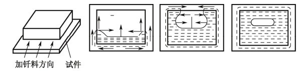 当钎料填充一端大、一端小的不平行间隙时,由于毛细作用力是与间隙的大小成反比的,间隙越小,毛细作用越强,因此液态钎料(或助焊剂)就具有优先填充小间隙的趋势。有关液态钎料填缝过程的X 射线摄影的研究结果表明,当液态钎料在不平行间隙中填缝时,不论是在大端、小端或侧端间隙处加入钎料,液态钎料总是优先填满小端间隙,然后逐渐向大端间隙方向推进(见图2.34)。图2.35给出了钎料填缝运动趋势。