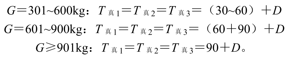 按“369”节能法则1,装炉量在100~200kg,工件有效尺寸在100mm左右时,按下式计算:T 真1 =T 真2 =T 真3 =0.4G+D。
