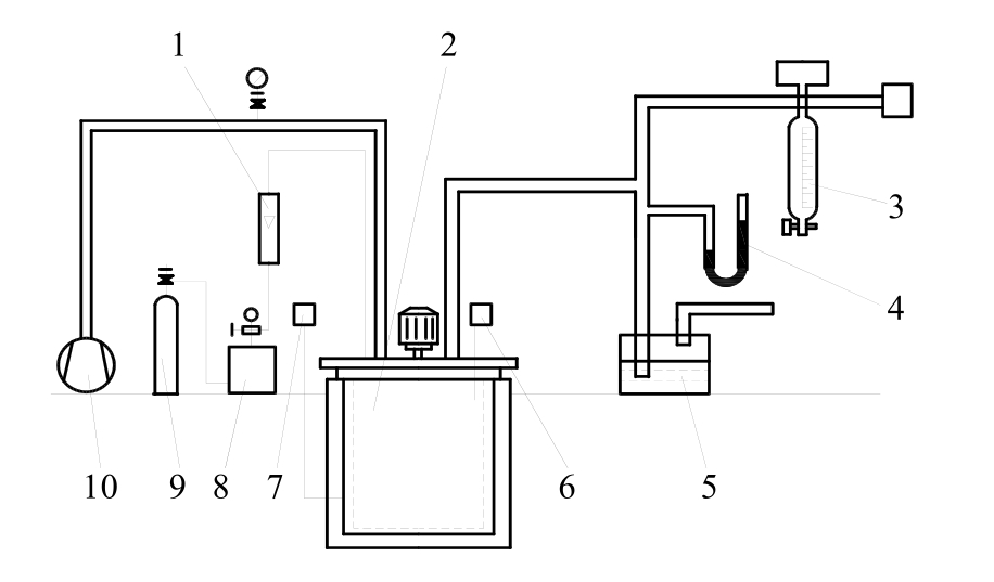 1—流量计 2—渗氮罐 3—氨分解测定计 4—压力计5—泡泡瓶 6,7—热电偶 8—干燥箱 9—氨瓶 10—真空泵
