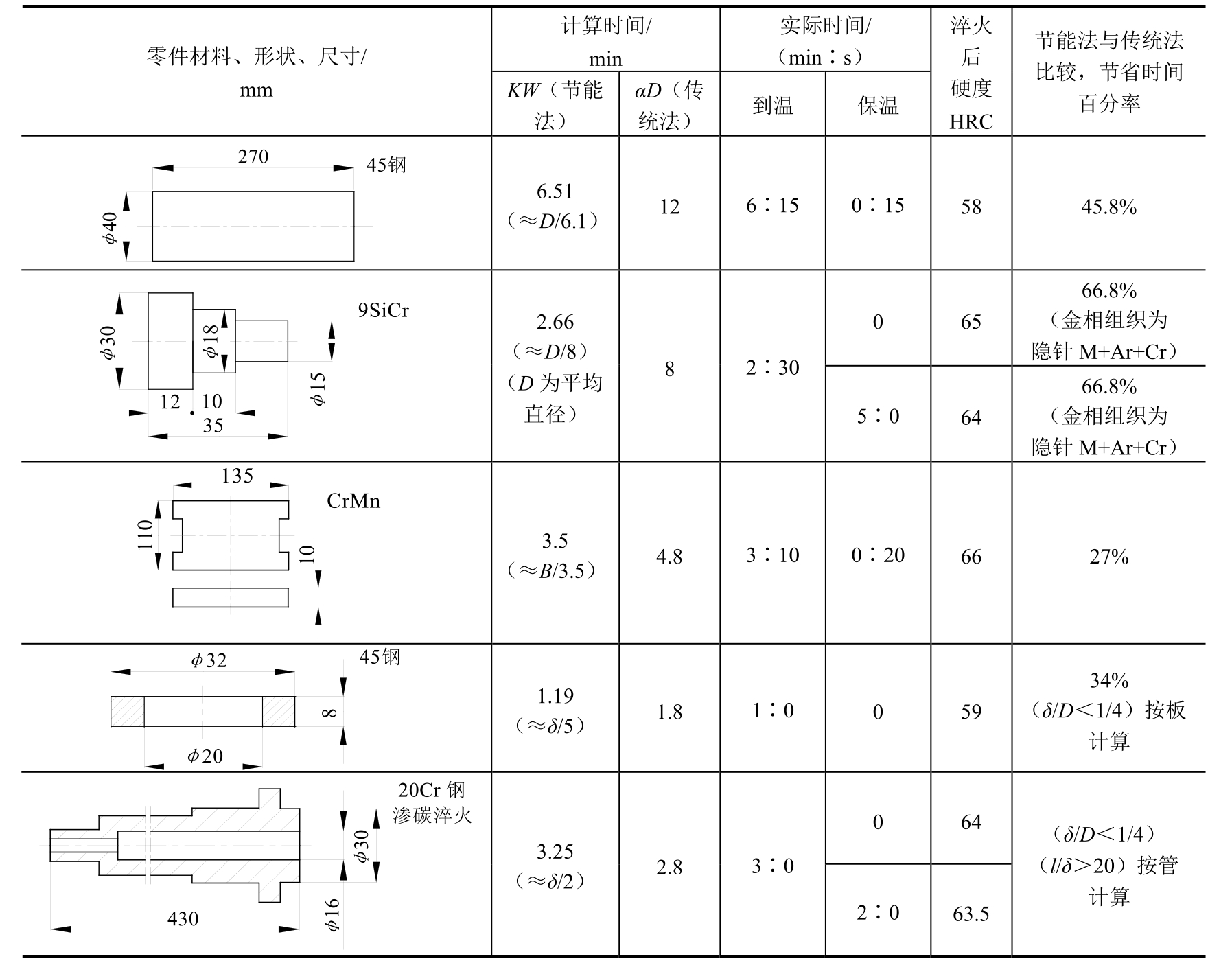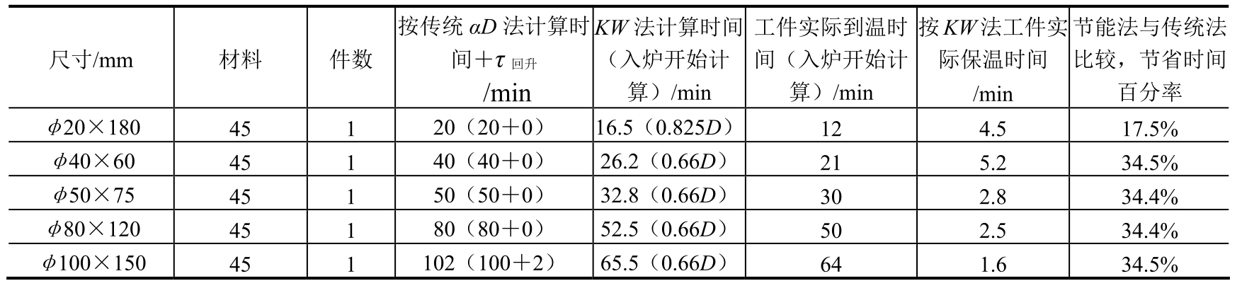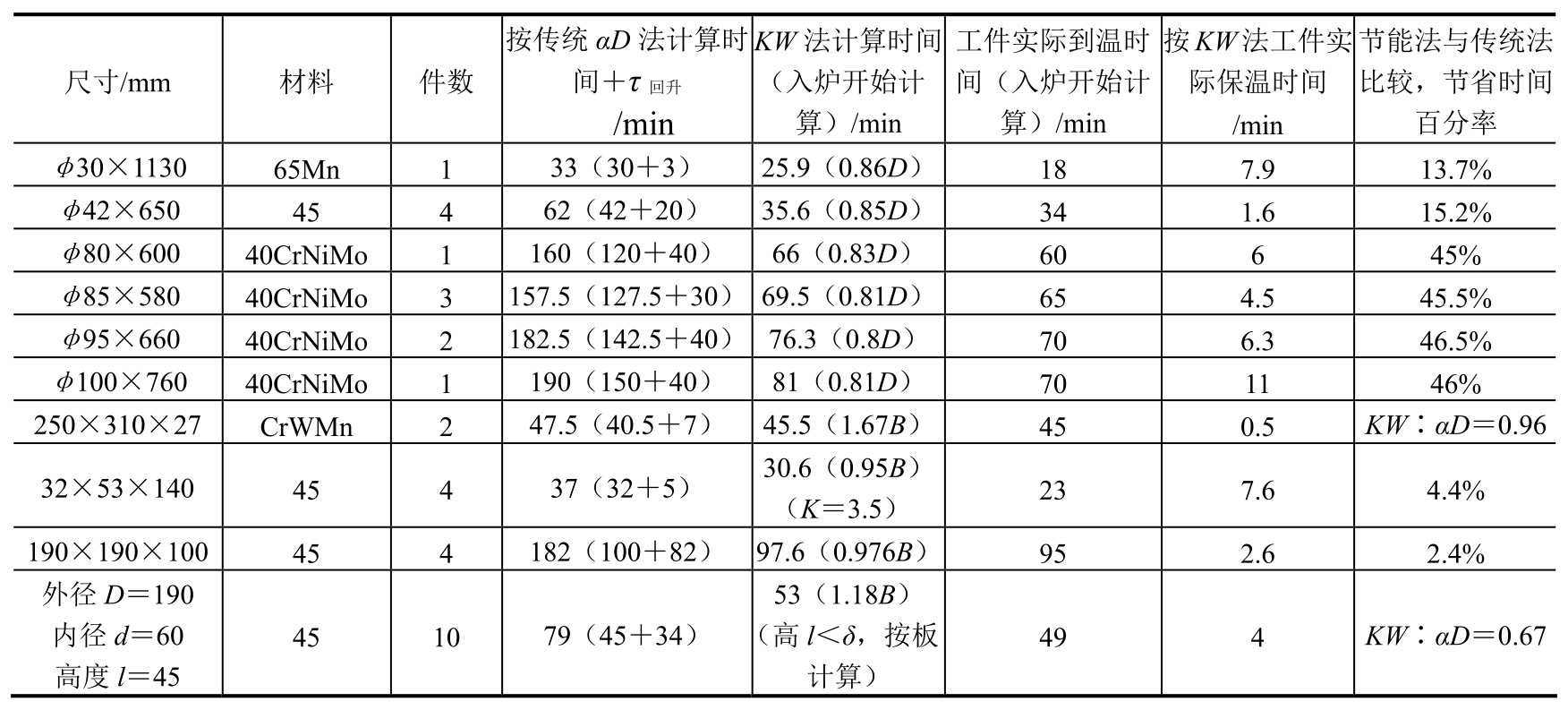 (1)在盐浴炉中的节能加热时间计算公式。表1-3为一些典型形状、尺寸的实际零件的加热时间试验结果。并与传统加热时间计算法(τ=αD)作了比较(碳钢α取0.3,合金钢α取0.4)。从表1-3的技术中可以看出,用KW法计算时间比用传统法时间要短,但均能保证工件到温并略有保温。从管状零件看,虽然KW计算时间比传统法计算时间有时还要长一些,但传统法计算的没有使工件到温。总之,KW计算法比传统法计算时间更符合加热的真实情况,因此可以达到节能降耗的效果。