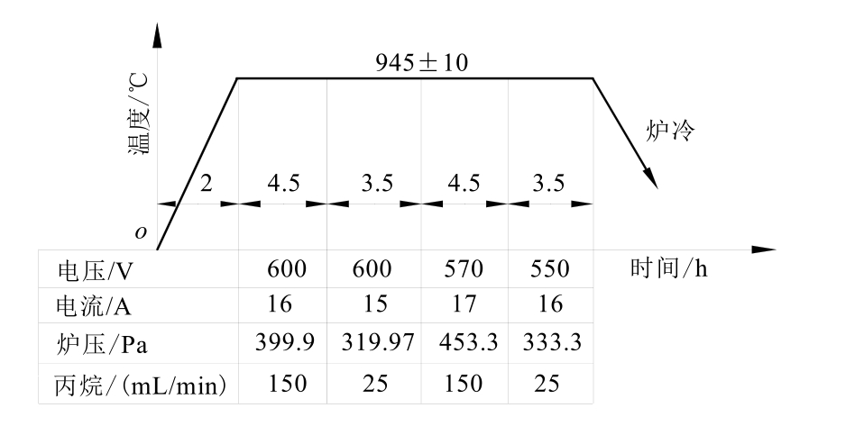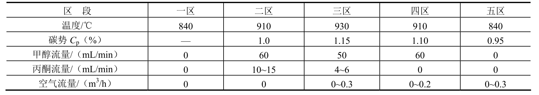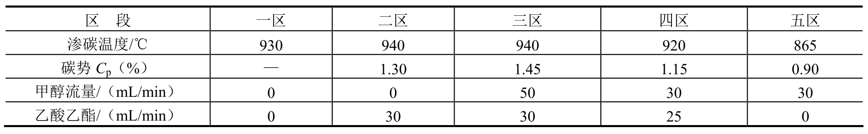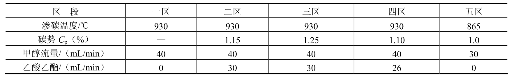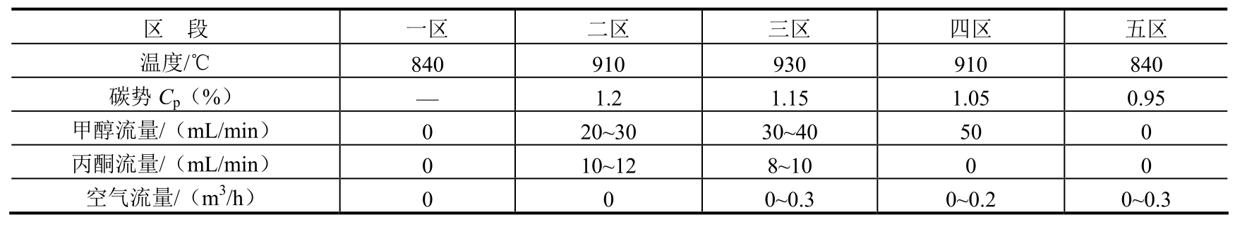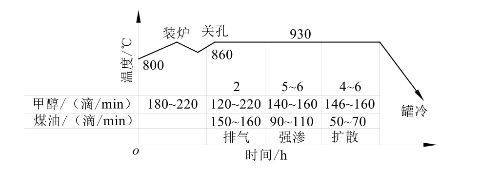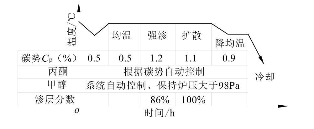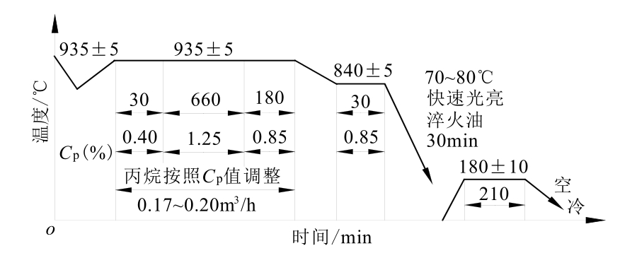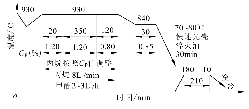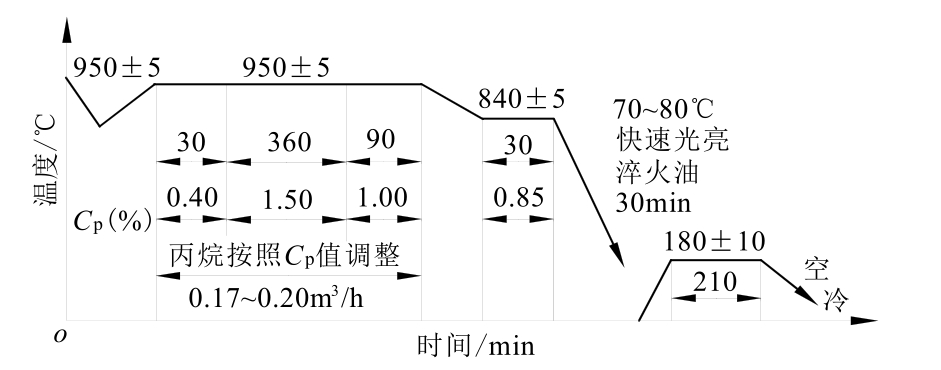 (1)常规深层渗碳工艺及存在问题。某零件材料为20CrMnTi钢,渗碳层深度要求>5.5mm。其渗碳设备为RQ3-450-9型无底式马弗罐渗碳炉,渗碳富化剂为丙酮,载体介质为甲醇。渗碳工艺过程采用分段控制法,并应用微机碳势控制系统。