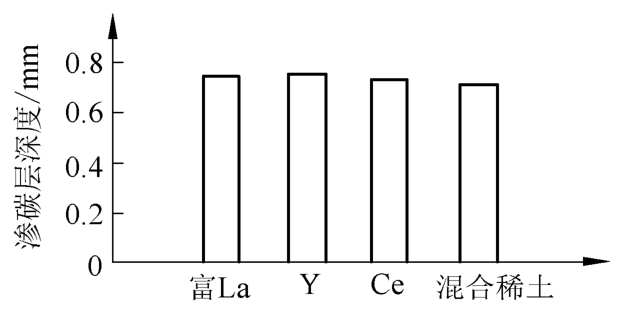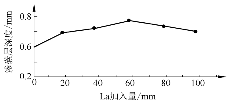 ②缓冲渗碳+淬火回火工艺处理后。20CrMnMo钢渗层组织由回火马氏体、残余奥氏体以及弥散分布于回火马氏体基体上的细颗粒状碳化物,渗层表面与心部硬度分别为740HV和480HV,渗碳层的有效硬化层深度为5.95mm(550HV)。