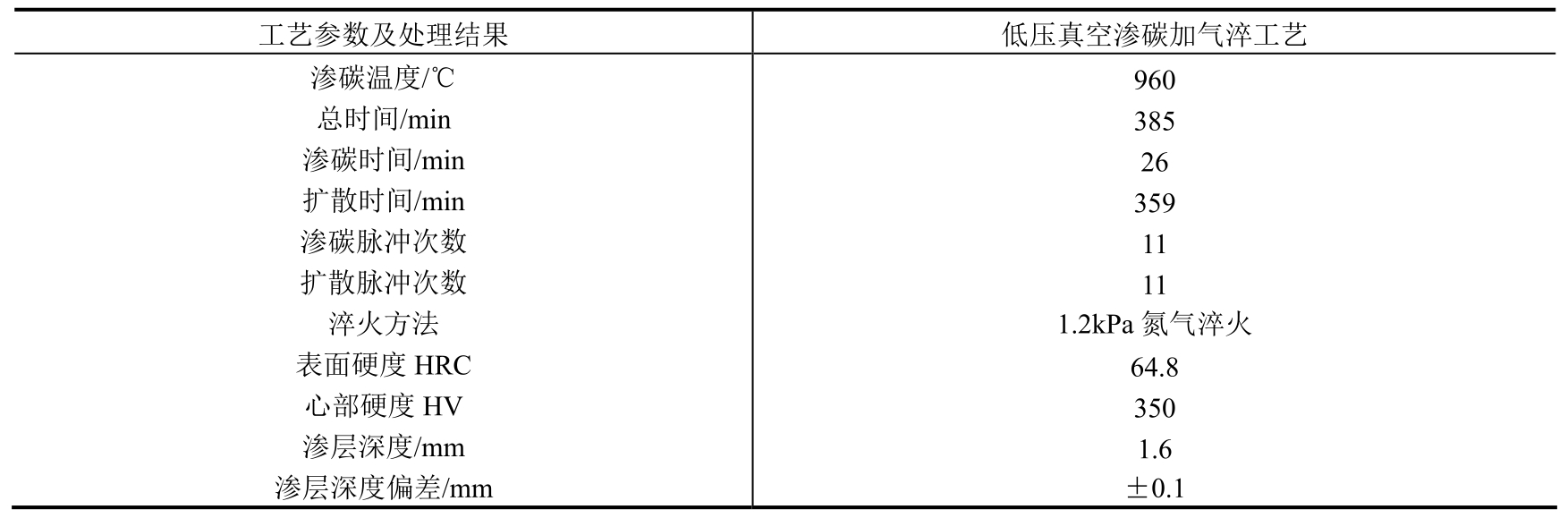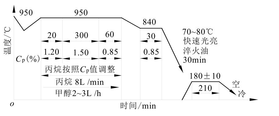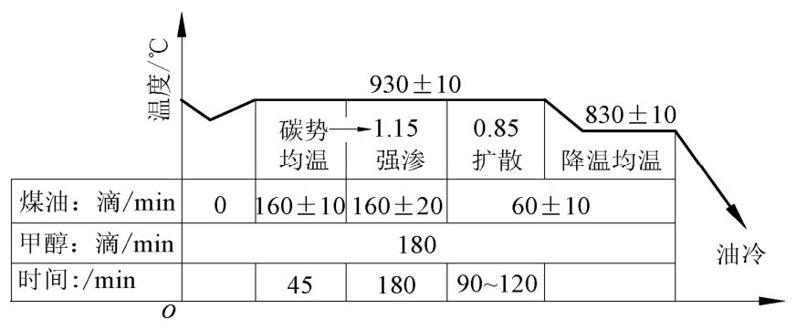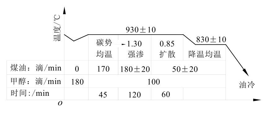 生产中应用该工艺时要保证载体介质的滴注量,换气次数在5次左右,炉压为98~196Pa,炉温的温差<±2℃。生产中要严格控制高碳势的时间,防止产生过多的炭黑以降低渗碳速度。保证至少每12h定碳一次。