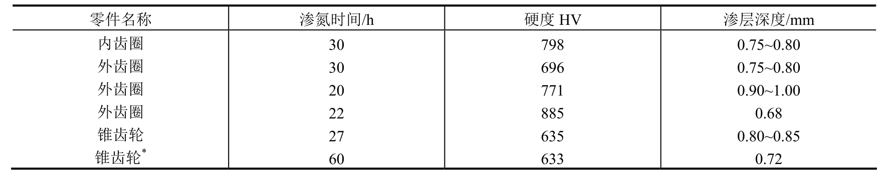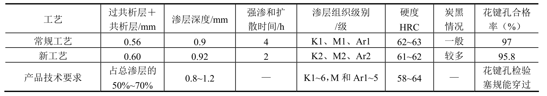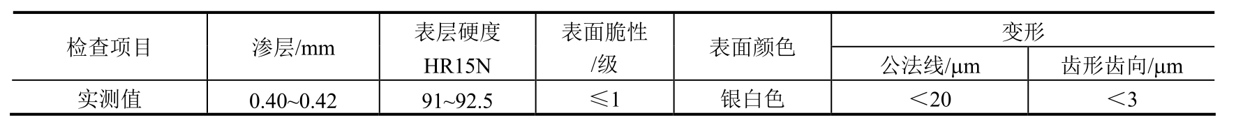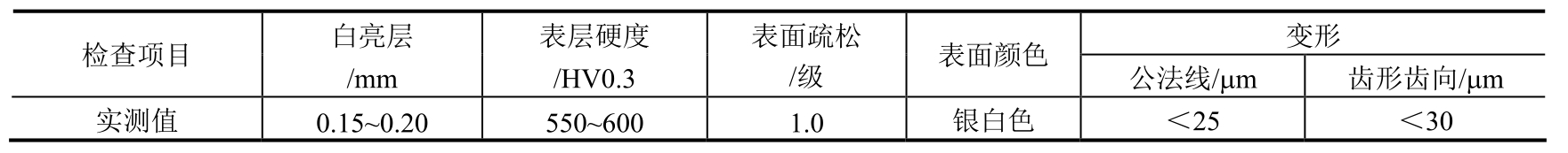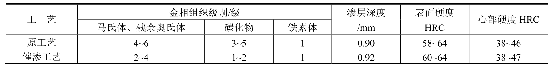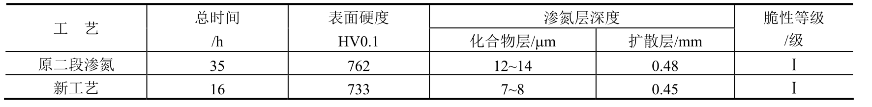 采用快速碳氮共渗工艺处理后,表面几乎不出现炭黑,也未出现黑色组织。工件表面硬度、渗层深度等均能达到产品技术要求,经模拟旋转考核试验,时间超过1500h,效果理想。