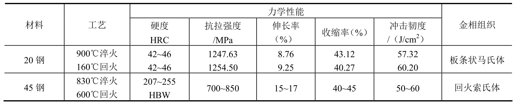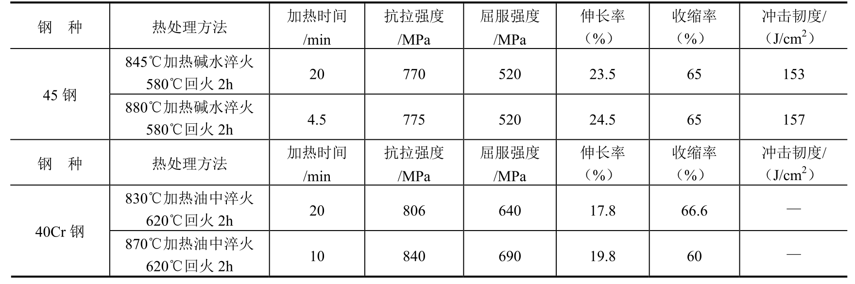 试验主要对45钢、40Cr、42CrMo、GCr15、40CrMnMo和T10钢等几种常用材料进行淬火试验。采用比较法,即试件的化学成分、形状尺寸、加热温度、冷却条件完全相同,同时进炉,只是加热时间不同,进行对比试验。下面仅将部分试验数据及结果列举如下。