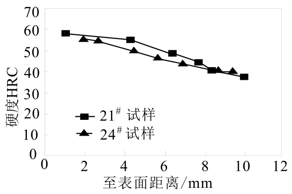 ①材料为40Cr钢,φ75mm,加热温度820℃,饱和氯化钙水溶液冷却。21 # 试样的加热:1.5×7.5min=11.25min;24 # 试样的加热时间:4×7.5min=30min。淬火后两试样表面硬度均在58~63HRC,淬硬层深度约为7.0~8.0mm,截面上硬度分布见图1-3。由图 1-3可见,φ75mm的40Cr钢试样的加热系数取接近黄金数字1.5时,与加热系数取4.0时,热处理结果相近,但却节省时间:30-11.25=18.75(min)。