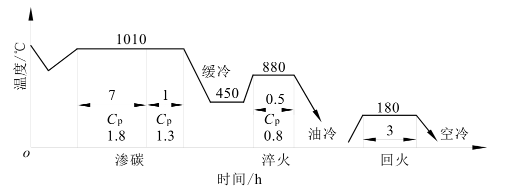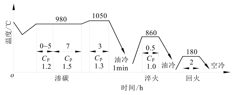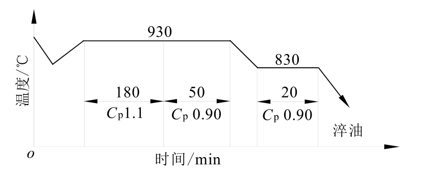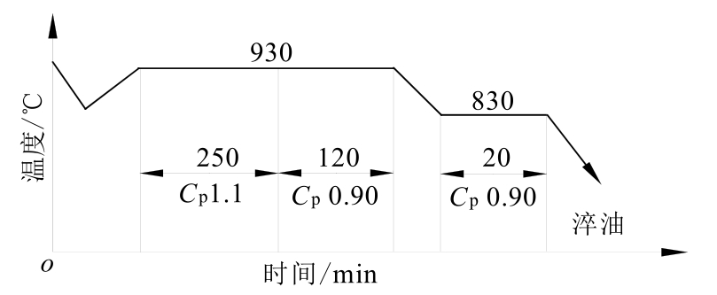 零件深层渗碳的常规工艺如图1-79所示。通过微机控制系统模拟,该工艺渗层深度达5.5mm的工艺时间为165h左右,C p 为炉气碳势,渗碳温度为920℃。分段的工艺时间由微机控制系统根据炉温、碳势自动调整。其中强渗阶段完成渗层渗碳的86%需要110h,扩散阶段完成渗层深度的100%需要45h,降温到880℃保温1h出炉。由于渗碳时间长,故能耗大,零件热处理变形大。