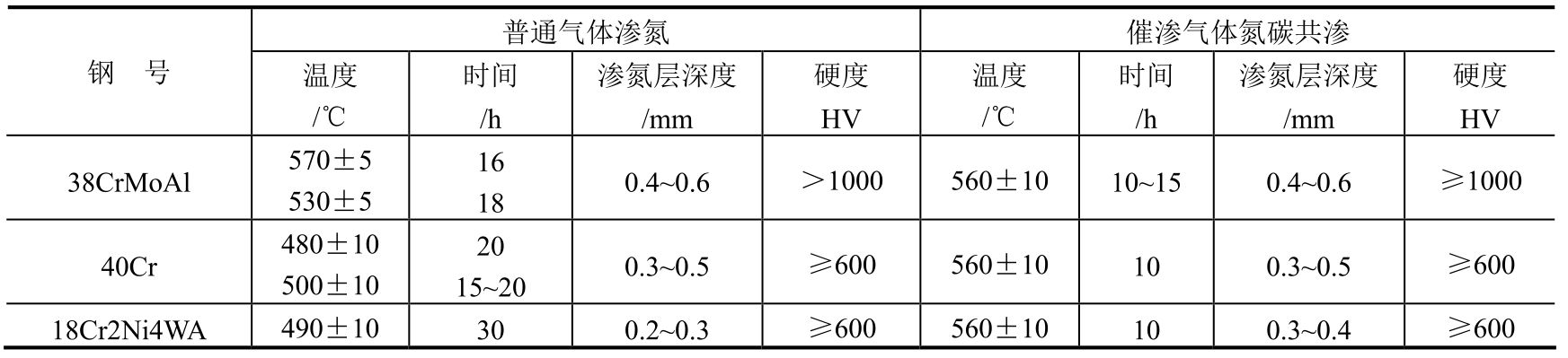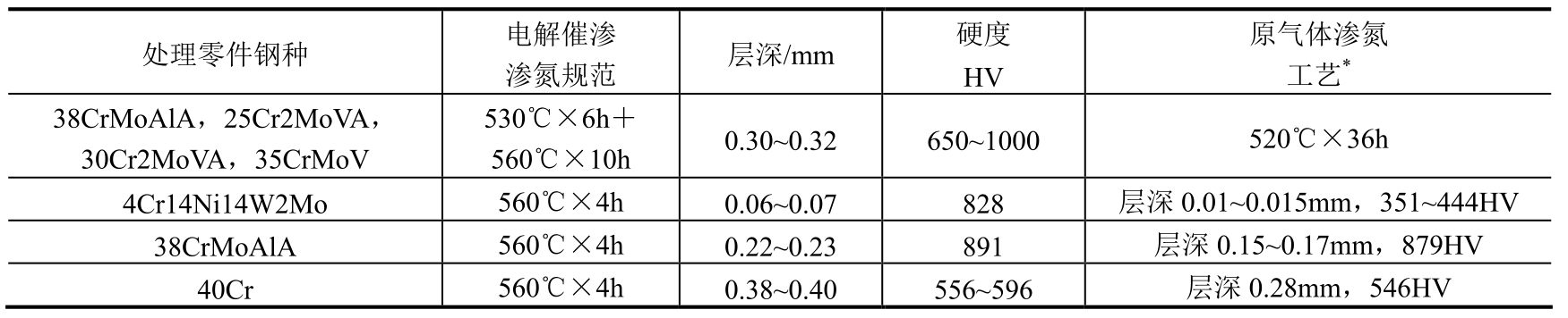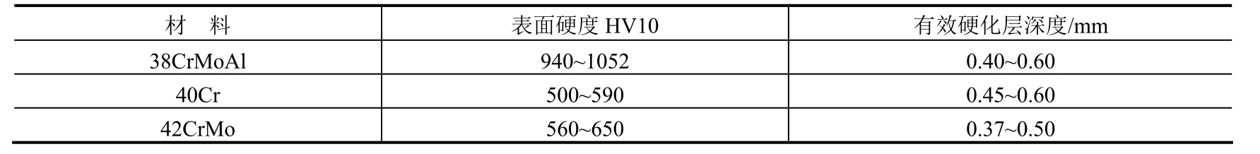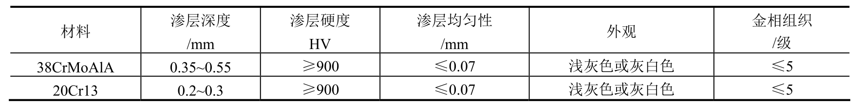 ②渗氮试样硬度检测结果。38CrMoAl钢:改造前后分别为1035~1050HV和1045~1051HV;20Cr13钢:改造前后分别为935~950HV和942~950HV。从检验结果可以看出,设备改造后工件渗氮层硬度与改造前基本相当,符合表1-70技术要求。