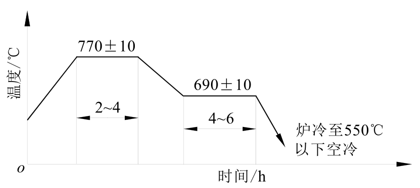 (1)两段渗碳工艺及存在问题。采用德国制造的大型井式渗碳炉,炉膛有效尺寸φ2800mm×2000mm,热处理工艺过程采用计算机在线控制。工艺曲线如图1-77所示。渗碳(强渗、扩散)后,对渗碳件及随炉试棒(φ40mm×110mm)进行了3次球化退火处理。最后,进行淬火及回火处理。
