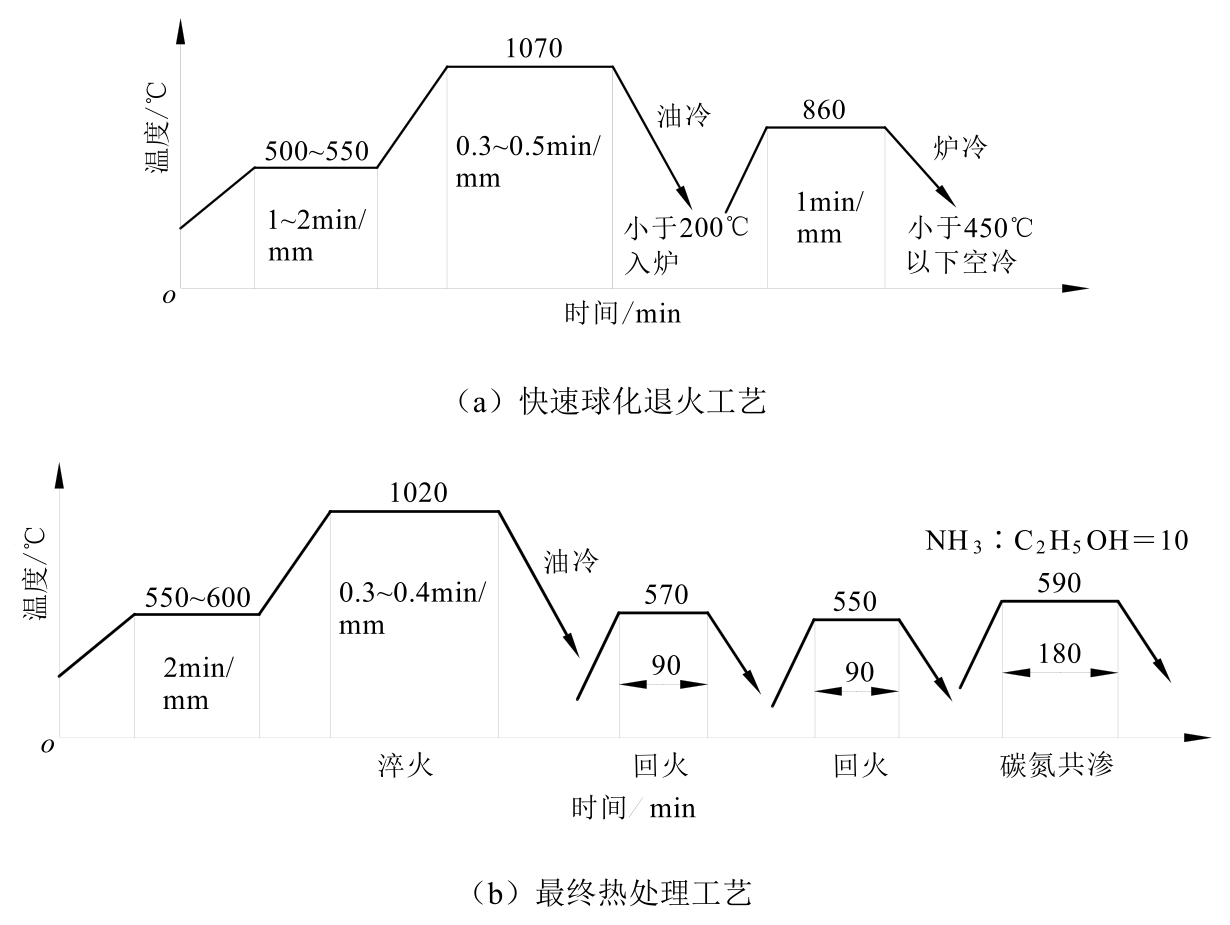 (1)原加工工艺路线。锻坯→正火→粗车→调质→机加工→高频淬火→磨削内孔。由于加工工序繁多,能耗大,成本高,生产效率低。