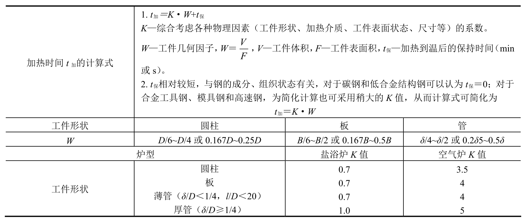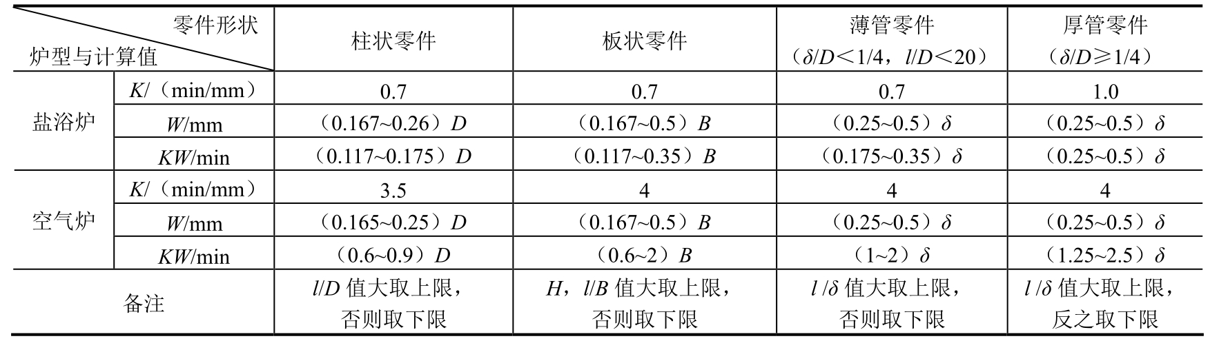 K为修整系数,在空气炉中加热时,当工件进炉时炉温已经达到规定温度,但没有影响炉温,或炉温稍有下降而在较多时间内又重新升到规定温度时,K值取4;其他情况K值取1;