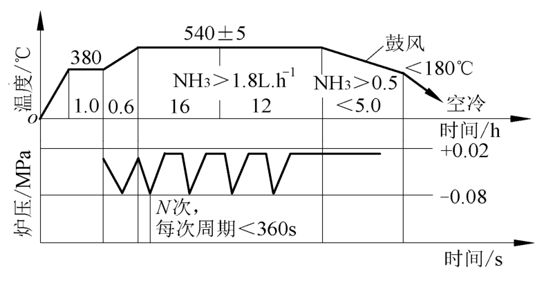 (4)节能降耗效果。设备改造后,排气时间减少,缩短了工件的渗氮周期,若渗氮炉功率按75kW计算,则每炉可节约电能约300kW·h。同时,提高了生产效率。