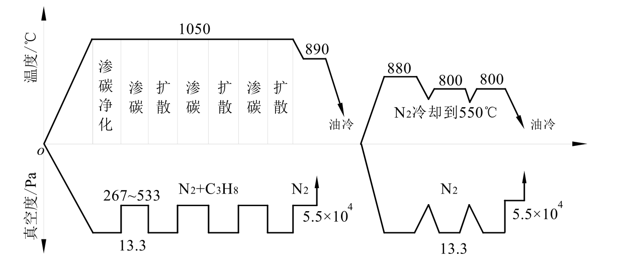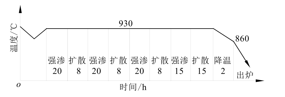 在实际生产应用中,不能单纯追求渗层中碳含量和表面硬度,还应该考虑淬硬层的显微组织和性能。首先,过高的碳势会使工件表面含碳量过高,导致形成的碳化物太多、粒度太大,最终一些大于1μm的碳化物成为破断的裂纹源。其次,由于工件对碳原子吸收能力的限制,在工件表面积存大量的碳原子,形成炭黑,使气氛中新产生的活性碳原子被阻隔在工件的表面,反而会使渗碳速度降低。因此,不能将整个渗碳过程都维持在一个高的碳势,可以在渗碳开始阶段迅速提高炉气碳势,形成较大的浓度梯度,然后进行一段时间的扩散,到炉内碳势趋于平衡后,工件内表面和外表面浓度梯度降低。此时再提高炉气碳势,使炉气及工件内表面形成一个较大的浓度梯度,此后降低碳势开始下一段扩散。这样是将强渗分为两个或者 3 个阶段,中间是较长时间的扩散,使每个阶段都有一定的浓度梯度,提高了扩散驱动力,从而提高渗碳速度。