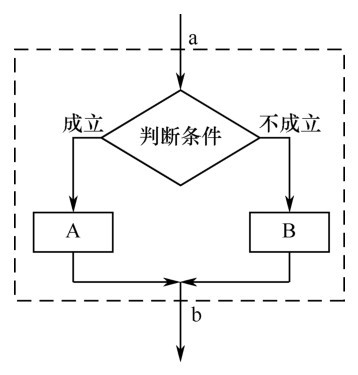 如图1-38所示,虚线框内是一个选择结构,此结构中包含一个判断框,根据条件是否成立而选择执行A还是B,执行完成后,经过b点脱离选择结构。