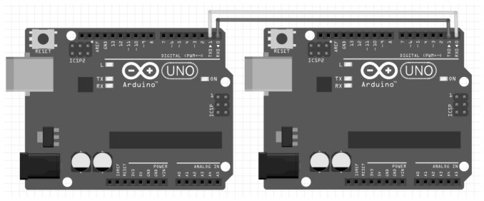 本节实例采用两条杜邦线将两块Arduino板的通信口交叉连起来,其中一块Arduino每隔1s发送一个值为0x55的字节,另一块Arduino收到该字节后控制13号引脚的LED转换状态。