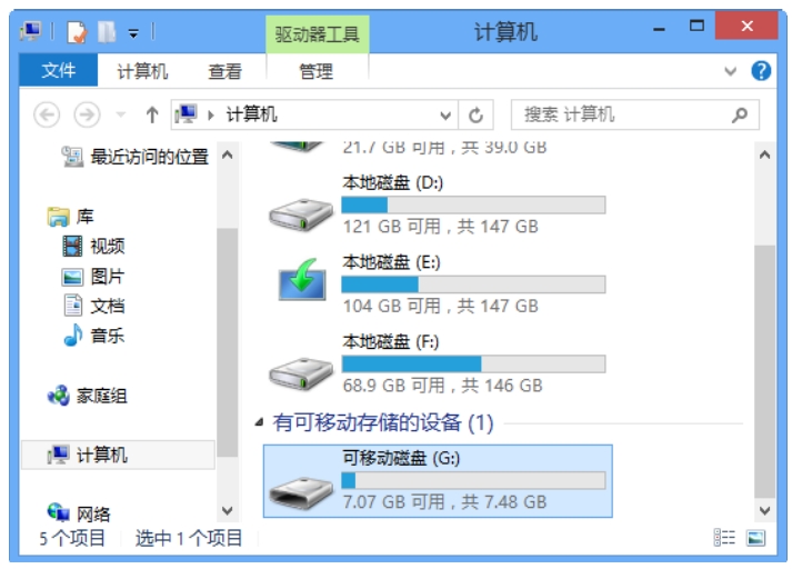 使用U盘和移动硬盘时,将其插入主机箱前面板或后面板上的USB接口中。稍等片刻后,打开“计算机”窗口,在“可存储移动设备栏”可以看到新安装的移动存储设备,双击移动存储设备图标,即可进入U盘或移动硬盘了。