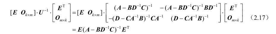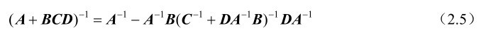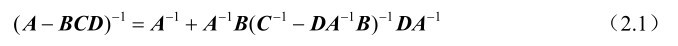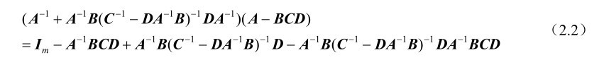推论2.1: 设矩阵A∈R m×m ,B∈R m×n ,C∈R n×n 和D∈R n×m ,并且矩阵A、C和C -1 +DA -1 B均可逆,则下面的矩阵恒等式成立:
