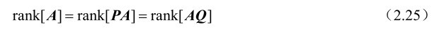证明: 首先根据命题2.3可知rank[PA]≤rank[A],又因为A=P -1 PA,再一次利用命题2.3可以证明rank[A]≤rank[PA],综合可知rank[A]=rank[PA]。同理可以证明rank[A]=rank[AQ],因此式(2.25)成立。