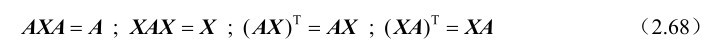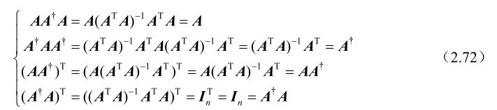由式(2.72)可知A † =(A T A) -1 A T 满足Moore-Penrose广义逆的4个条件。