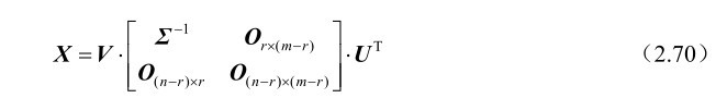 根据上述定义可知,若 A是可逆方阵,则有 A † =A -1 。另外,满足式(2.68)的Moore-Penrose 逆矩阵存在并且是唯一的,它可以通过矩阵A的奇异值分解获得,具体可见下述命题。
