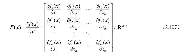 定义2.7:假设有m 个多维函数构成函数向量 f(x)=[f 1 (x)f 2 (x)f m (x)] T (其中 T x=[x 1 x 2 x n ]),则其Jacobi矩阵定义为