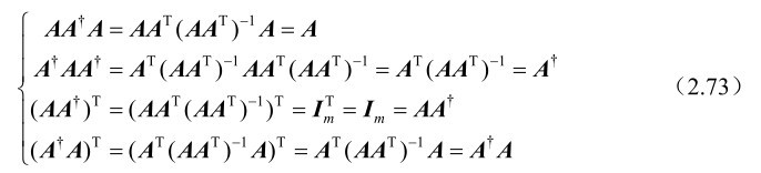 由式(2.73)可知A † =A T (AA T ) - 1满足Moore-Penrose广义逆的4个条件。
