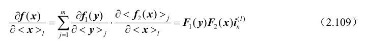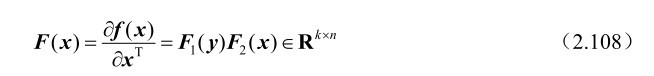 命题2.22: 设有2个函数向量 f 1 (y)和f 2 (x),其中x∈R n×1 ,f 2 (x)∈R m×1 ,y∈R m×1 ,f 1 (y)∈R k×1 ,定义复合函数 f(x)= f 1 (f 2 (x)),则复合函数向量 f(x)关于向量x的Jacobi矩阵可以表示为
