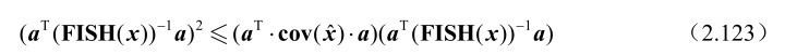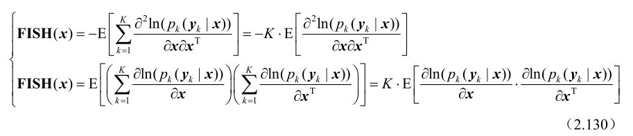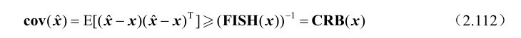 需要指出的是,命题2.23中的FISH(x)称为未知参量 x的费希尔信息矩阵,而CRB(x)称为未知参量 x的克拉美罗界矩阵,这两个矩阵是互逆的关系,即有CRB(x)=(FISH(x)) -1 。