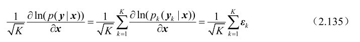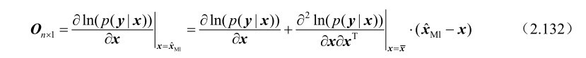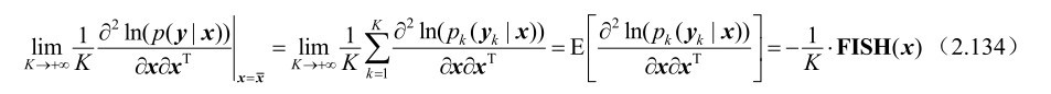 假设m维随机观测向量y受到n(n≤m)维确定参量x的支配,其概率密度函数p(y|x)的对数函数ln(p(y|x))的一阶、二阶导数都存在,并且满足式(2.111)所示的“正则”条件,则其最大似然估计